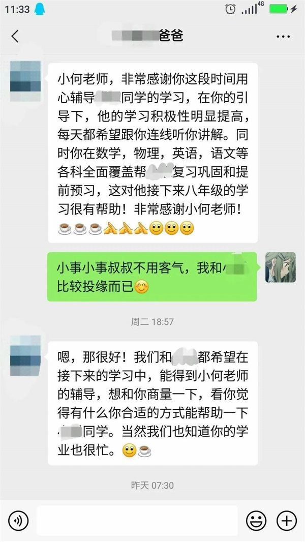 2021年的第一次線上志愿輔導(dǎo)在我的激動(dòng)、欣喜、緊張交錯(cuò)之中開始了。第一步也是最重要的一步:和家長(zhǎng)進(jìn)行交流與溝通。說(shuō)實(shí)話,我的心里還是非常忐忑的:害怕家長(zhǎng)不回復(fù)消息,害怕不能很好地了解小朋友的學(xué)習(xí)狀況。但其實(shí)邁出溝通的第一步之后,后面的對(duì)話就很自然了,并沒(méi)有想象中的那么困難和緊張。而且很幸運(yùn)的是,家長(zhǎng)很配合我們的輔導(dǎo)活動(dòng),我的心里瞬間就放松了不少,自信心也莫名大增!被叫老師,真是很久違的感覺,令我成就感倍增,獲得了家長(zhǎng)的稱贊也讓我很開心。而我本身也很喜歡數(shù)學(xué),希望我的興趣可以感染到小朋友,讓她也能喜歡數(shù)學(xué)。也希望通過(guò)基本的閱讀寫作教學(xué),讓她能夠提升自己。