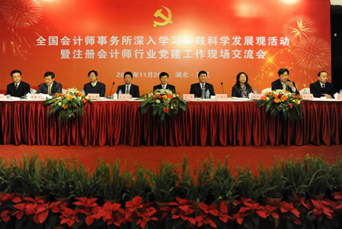 11月26日,財政部會計師事務(wù)所深入學(xué)習(xí)實踐科學(xué)發(fā)展觀活動指導(dǎo)小組、中國注冊會計師行業(yè)黨委在湖北省武漢市召開全國會計師事務(wù)所深入學(xué)習(xí)實踐科學(xué)發(fā)展觀活動暨注冊會計師行業(yè)黨建工作現(xiàn)場交流會,深入學(xué)習(xí)貫徹黨的十七屆四中全會精神,總結(jié)各省市區(qū)會計師事務(wù)所學(xué)習(xí)實踐活動和行業(yè)黨建工作做法,交流經(jīng)驗,探討方法,凝聚共識,更加扎實有效地推進(jìn)會計師事務(wù)所學(xué)習(xí)實踐活動和行業(yè)黨建工作。財政部黨組成員、副部長、財政部會計師事務(wù)所深入學(xué)習(xí)實踐科學(xué)發(fā)展觀活動指導(dǎo)小組副組長、中國注冊會計師行業(yè)黨委書記王軍,湖北省委常委、常務(wù)副省長李憲生出席會議并講話。