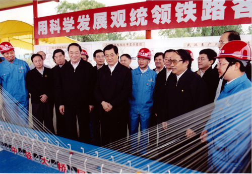 2005年8月22日上午,中共中央總書(shū)記、國(guó)家主席、中央軍委主席胡錦濤同隨行的中共中央政治局候補(bǔ)委員、中央書(shū)記處書(shū)記、中央辦公廳主任王剛,在中共中央政治局委員、湖北省委書(shū)記俞正聲,湖北省省長(zhǎng)羅清泉等陪同下,考察了正在建設(shè)中的武漢天興洲公鐵兩用長(zhǎng)江大橋工程,對(duì)鐵路建設(shè)作出重要指示。胡總書(shū)記指出,武廣鐵路客運(yùn)專線和武漢天興洲大橋是中國(guó)鐵路建設(shè)史上新的里程碑。這條鐵路線的建設(shè)標(biāo)志著中國(guó)鐵路客運(yùn)專線建設(shè)的開(kāi)始,今后要建設(shè)更多的鐵路客運(yùn)專線。一定要把武廣客運(yùn)專線和天興洲大橋這個(gè)我國(guó)鐵路建設(shè)史上新的里程碑工程建設(shè)好。