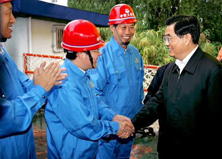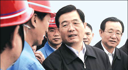 中共中央總書(shū)記胡錦濤與施工代表親切交談