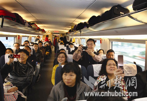 荊楚網(wǎng)消息 (楚天金報(bào)記者譚新杰 通訊員郭金富、劉強(qiáng))12月26日上午9時(shí),三列嶄新的時(shí)速350公里“和諧號(hào)”高速列車從武漢站、長(zhǎng)沙站和廣州北站同時(shí)首發(fā),標(biāo)志著目前世界上運(yùn)營(yíng)速度最快、一次性建成里程最長(zhǎng)的高鐵新干線——武廣客專正式投入運(yùn)營(yíng)!瓣懙仫w行下廣州,千里南國(guó)一日還”的時(shí)代已經(jīng)到來(lái)。